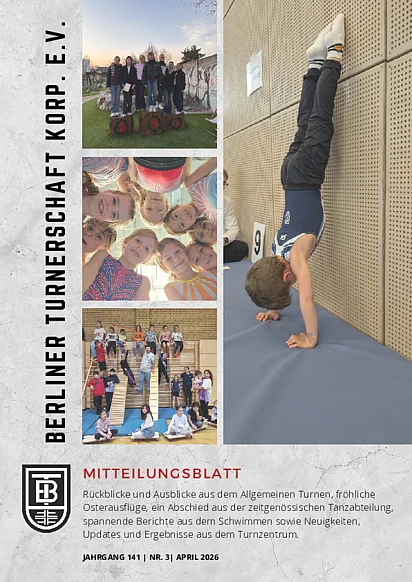 Unser Mitteilungsblatt erscheint 6x im Jahr und ist selbstverständlich auch als Download erhältlich. In dem Mitteilungsblatt findet ihr aktuelle Vereinsinformationen, Vorstellungen und Gratulationen von Mitgliedern und Berichte direkt aus den Abteilungen der Berliner Turnerschaft. Eure Beiträge oder bei redaktionellen Fragen oder Anregungen bitte direkt an mb@berlinerturnerschaft.de wenden.